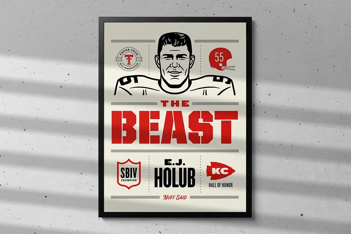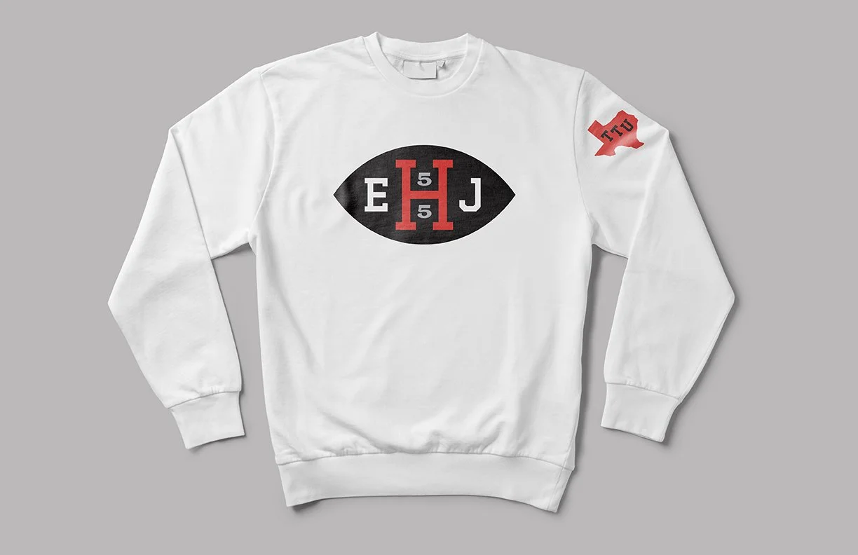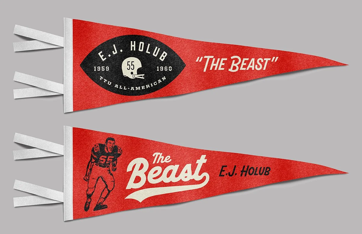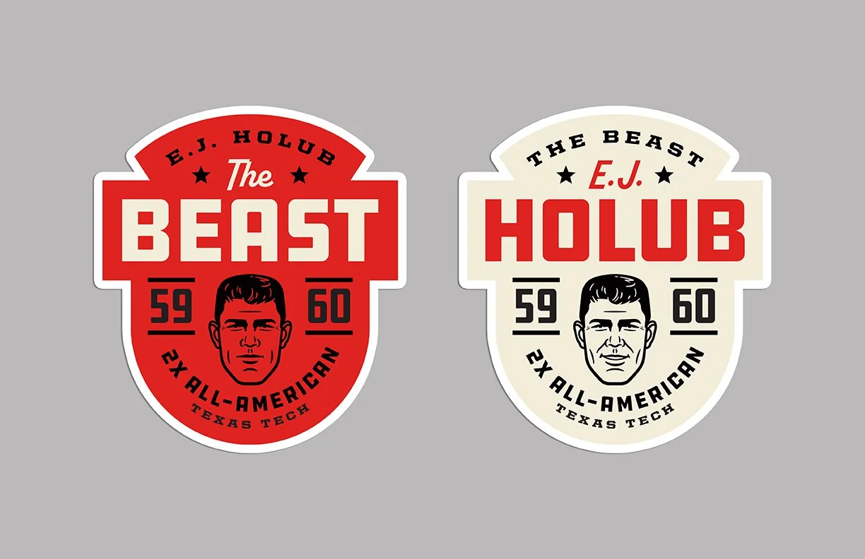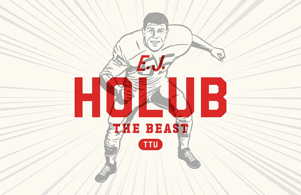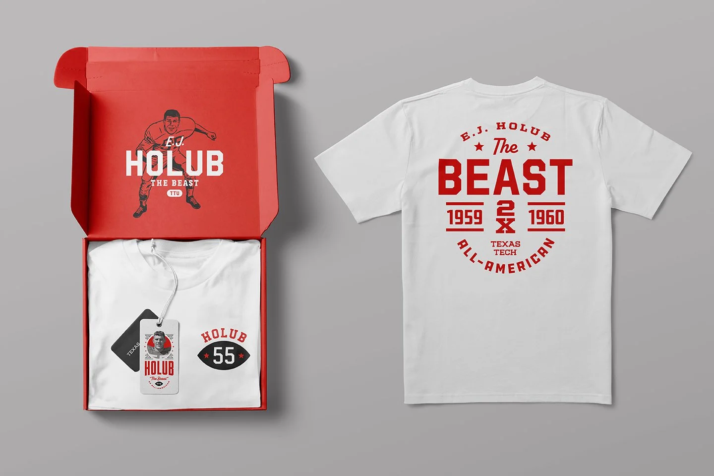 Texas Tech University hired me to develop a merchandise collection honoring football legend EJ Holub, a two-time All-American and Super Bowl champion. Starting with a t-shirt design to establish the look and feel, I built out a full visual system that includes custom illustrations, bold typography, and retro-inspired layouts.